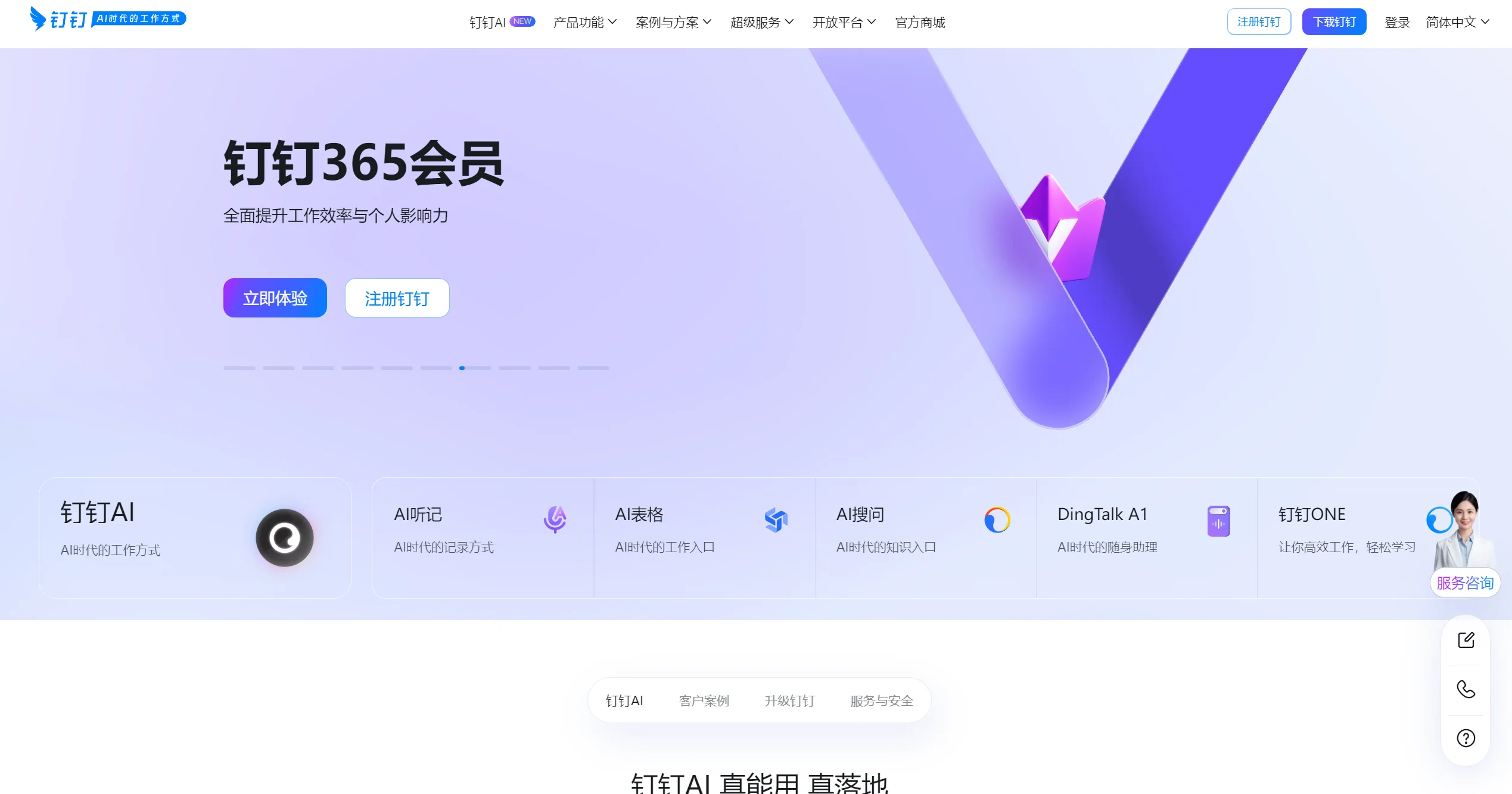钉钉提供全面的企业协同办公功能:即时通讯支持已读未读状态显示和DING消息强提醒;协同办公包括钉钉文档(支持多人在线编辑)、钉盘(企业云盘)、日程管理;管理工具涵盖OA审批、智能人事、考勤打卡、日志汇报;会议解决方案提供最高支持302人同时在线的视频会议及"钉闪会"高效开会套件;开放平台拥有超过2000个API接口,支持低代码应用开发;AI能力集成通义千问大模型,提供AI摘要、AI创作等智能助理功能。